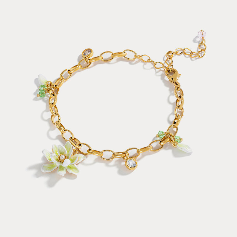 Last Chance to Shop – Up to 80% OFF! At Luna&Lucas, we’re clearing our collection with incredible discounts on all our beautiful jewelry. Don’t miss your chance to own this elegant floral bracelet featuring a hand-crafted white gardenia symbolizing purity, strength, and eternal love. The finely detailed gardenia is accented with a delicate white pearl, surrounded by white petals and faceted glass stones that add graceful movement.